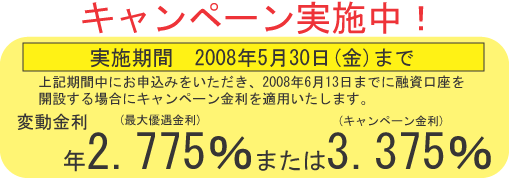 | 3.375%(変動金利、保証料を含みます) 新規のご融資金利は、キャンペーン期間中(2007年12月17日から2008年5月30日まで)に限り、上記のキャンペーン金利を適用いたします。 ご融資後の金利は毎年4月1日、10月1日の当行住宅ローン基準金利をもとに見直しを行い、6月および12月の約定返済日の翌日より新金利を適用します。 なお、ボーナス返済部分については、新・旧分かち計算をします。 |
